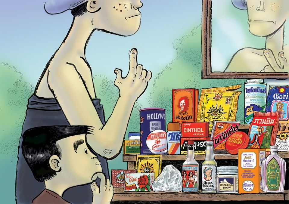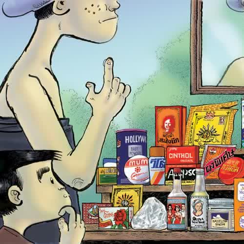 | คำอธิบาย : เดี๋ยวนี้สถานเสริมความงามทั้งร้านเสริมสวยและคลินิกความงามเปิดไว้รอคุณผู้หญิงทั้งหลายกันแทบจะทุกหัวถนนในสมัยก่อนก็จะมีแต่ร้านทำผมแต่งเล็บ ถ้าอยากสวย เหล่าคุณๆก็ต้องดูแล สรรหาเครื่องประทินผิว ทั้งครีมทั้งแป้งมาโปะมาโบ๊ะหน้ากันเอาเองและแน่นอนเมื่อเริ่มวัยสาว สิ่งที่จะมาเยี่ยมเยียนบนใบหน้าคุณๆก่อนเพื่อน ก็คือเม็ดสิว ซึ่งมีตั้งแต่เม็ดเล็กๆเหมือนผด ไปจนถึงขนาดใหญ่คือสิวหัวช้างผมเขียนภาพนี้ขึ้นมาเพราะนึกถึงการเป็นสิวในสมัยนั้น ซึ่งมีครีมหรือแป้งทาแก้สิวฝ้ากันไม่กี่ยี่ห้อ บางยี่ห้อก็หายไปจากตลาดแล้ว บางยี่ห้อก็ยังคงมีอยู่แต่เปลี่ยนรูปแบบให้ทันสมัยขึ้นไม่ใช่ว่าเรื่องจริงบ้านสวนผมจะวางเครื่องแป้งอย่างที่เห็นเยอะๆราวกับร้านเครื่องสำอางค์อย่างที่ผมเขียนหรอกนะฮะ ผมแค่นึกถึงยี่ห้อนั้นนี้ในสมัยก่อน แล้วก็เขียนขึ้นมารวมๆกันไว้อย่างที่จำได้ชัดๆหน่อยก็คือ #วิเศษนิยม ที่เอามาละลายน้ำให้ข้นทาแก้สิว หรืออาจใช้ #ทิพย์นิยม ซึ่งคล้ายๆกัน #ผงพิเศษตราร่มชูชีพ ที่อยู่ยั้งยืนยงเป็นขวัญใจบ้านๆแบบเราๆทั้งหลาย #แป้งน้ำสมใจนึก #แป้งน้ำมองเล่ย่ะ #แป้งน้ำพรรณงาม #แป้งน้ำควินา #แป้งผงโกรินอีกทั้งยังมีครีมต่างๆที่ใช้ทาแก้สิว ซึ่งก็ถือว่าทันสมัยมากในสมัยนั้นทั้ง #ครีมกวนอิม ของคุณประจวบ จำปาทอง #ครีมมัม ที่ทาทั้งหน้าและรักแร้สบู่แก้สิวฝ้าอีกหลากหลายยี่ห้อ #สบู่ด๊อกเตอร์มนตรี อันนี้ผมใช้ตอนเป็นวัยรุ่นแหละฮะ #สบู่ซินธอล #สบู่ยาอาเซปโซ และ #สบู่ยาเด๊กโซพอเขียนถึงสิ่งเหล่านี้ผมเลยเขียน #วีโต้ปราบเต่า กะ #แป้งไอโอเดิร์ม อีกทั้ง #สบู่โรเซท ที่ใครๆคุ้นเคยไปด้วย และ #สบู่ขิงตราเจดีย์ ที่ผมชอบกลิ่นมากๆด้วย #ครีมตราภูเขาเฮสลีนสโนว์ และ #ยาสระผมกันรังแคจัสโมเดิร์น แต่ที่ผมใช้ในชีวิตจริงช่วงนั้นคือ ก้อนใสๆเหมือนน้ำแข็งที่วางอยู่ข้างล่าง...มันคือ #สารส้มทาแก้เต่ารักแร้ฮะงานชิ้นนี้อาจเกี่ยวกับสินค้าไปหน่อย ผมไม่ได้ค่าโฆษณาใตๆนะฮะ ( ถ้าเจ้าของสินค้าเห็นแล้วจะให้ก็ไม่ว่ากัน ฮ่าๆๆๆ ) แต่ที่เขียนถึงสิ่งเหล่านี้เพราะผมเติบโตมากับเค้า มันเป็นวัตถุแห่งยุคสมัยที่ชวนให้ผมคิดถึงวันเก่าๆน่ะฮะและผมก็เชื่อว่าหลายๆท่านที่ติดตามเพจอยู่ก็เคยใช้อันใดอันหนึ่งมาบ้างแล้ว และคงมีความสุขเล็กๆบ้างถ้าได้นึกถึง |