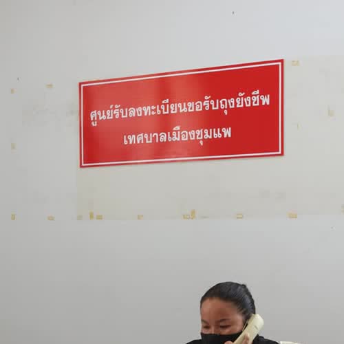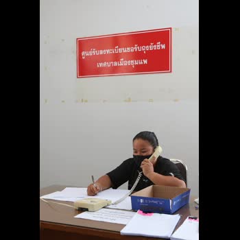 | คำอธิบาย : เจ้าหน้าที่เทศบาลเมืองชุมแพกำลัรับโทรศัพท์จากประชาชนผู้ที่ประสบปัญหาความเดือดร้อนจากการแพร่ระบาดของเชื้อไวรัสโควิด-19 ณ ศูนย์รับลงทะเบียนขอรับถุงยังชีพเทศบาลเมืองชุมแพ ซึ่งเปิดให้ประชาชนโทรศัพท์มาลงทะเบียนรับถุงยังชีพ ตั้งแต่วันที่ 11 - 13 เมษายน 2563 ระหว่างเวลา 09.00-21.00 น. |