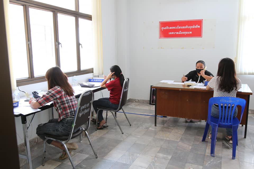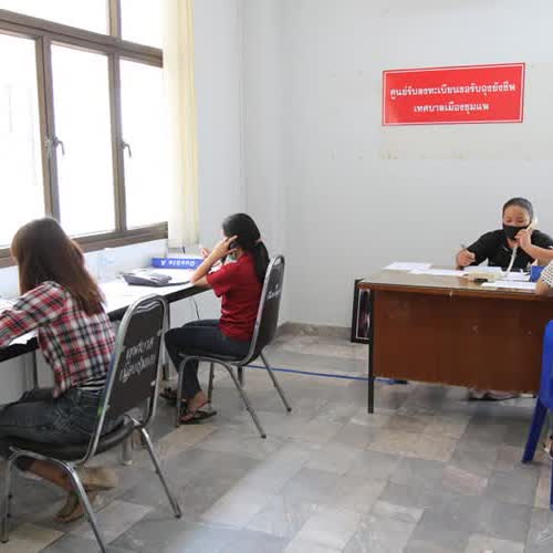 | คำอธิบาย : เจ้าหน้าที่เทศบาลเมืองชุมแพกำลัรับโทรศัพท์จากประชาชนผู้ที่ประสบปัญหาความเดือดร้อนจากการแพร่ระบาดของเชื้อไวรัสโควิด-19 ณ ศูนย์รับลงทะเบียนขอรับถุงยังชีพเทศบาลเมืองชุมแพ ซึ่งเปิดให้ประชาชนโทรศัพท์มาลงทะเบียนรับถุงยังชีพ ตั้งแต่วันที่ 11 - 13 เมษายน 2563 ระหว่างเวลา 09.00-21.00 น. |