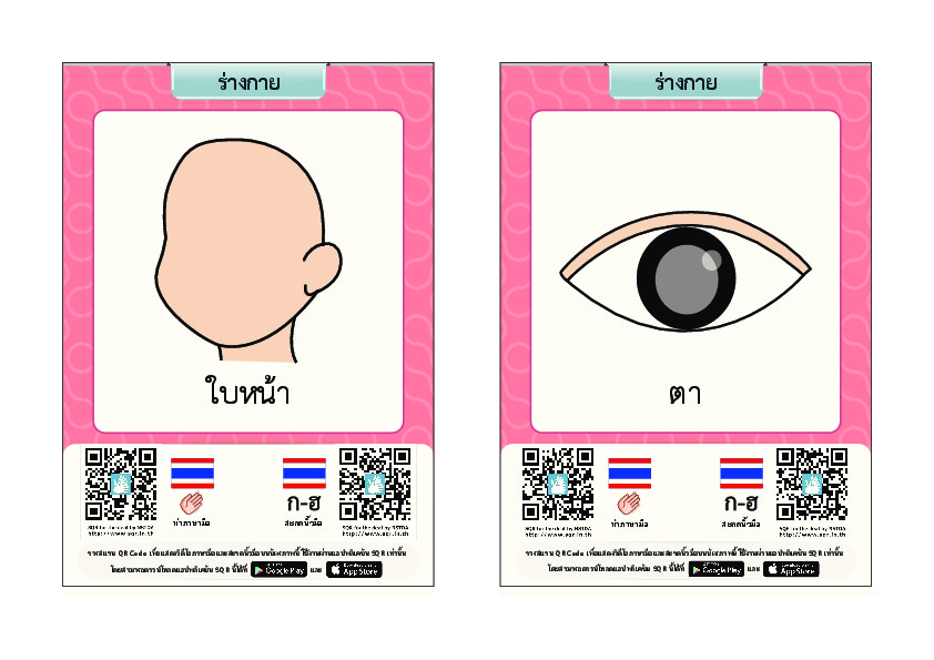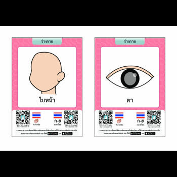 | คำอธิบาย : บัตรภาพคำศัพท์พหุภาษาสำหรับช่วยการอ่านและเขียนภาษาไทยให้แก่นักเรียนที่มีความบกพร่องทางการได้ยิน แต่ละบัตรภาพจะมีรูปภาพประกอบคำศัพท์และคิวอาร์โค้ดที่เชื่อมต่อไปยังวิดีโอการสะกดนิ้วมือและท่าภาษามือของคำศัพท์บนบัตรภาพนั้นๆ นักเรียนที่บกพร่องทางการได้ยินสามารถเรียนรู้การอ่านและเขียนคำศัพท์ผ่านการใช้แท็บเล็ตหรือสมาร์ทโฟนอ่านคิวอาร์โค้ดบนบัตรภาพคำศัพท์ เพื่อแสดงผลเป็นวิดีโอภาษามือให้เข้าใจได้ง่ายและเรียนด้วยตนเองได้บ่อยครั้งตามที่ต้องการ |