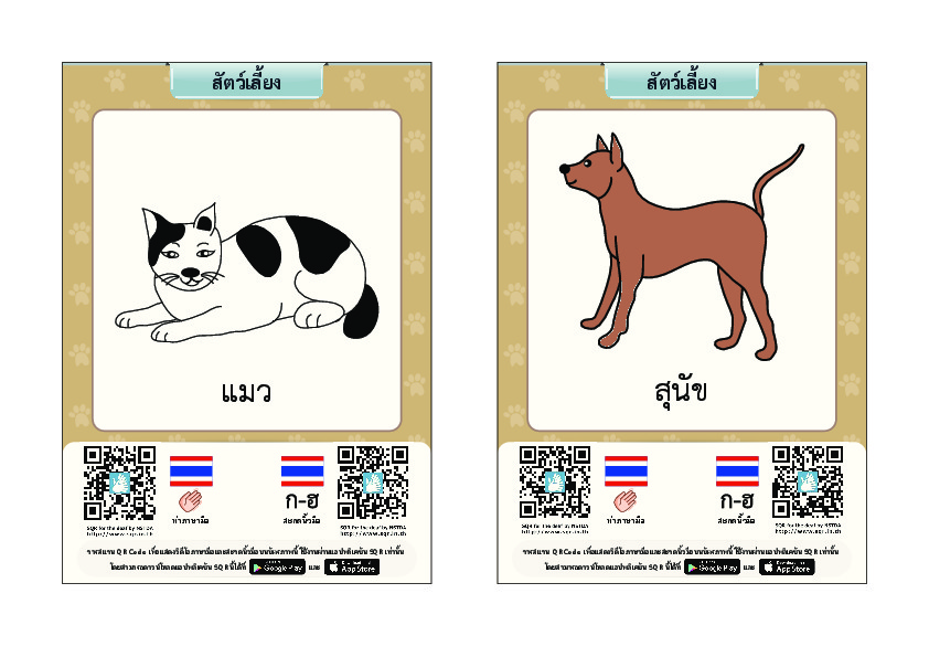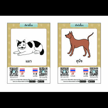 | คำอธิบาย : บัตรภาพคำศัพท์พหุภาษาสำหรับช่วยการอ่านและเขียนภาษาไทยให้แก่นักเรียนที่มีความบกพร่องทางการได้ยิน แต่ละบัตรภาพจะมีรูปภาพประกอบคำศัพท์และคิวอาร์โค้ดที่เชื่อมต่อไปยังวิดีโอการสะกดนิ้วมือและท่าภาษามือของคำศัพท์บนบัตรภาพนั้นๆ นักเรียนที่บกพร่องทางการได้ยินสามารถเรียนรู้การอ่านและเขียนคำศัพท์ผ่านการใช้แท็บเล็ตหรือสมาร์ทโฟนอ่านคิวอาร์โค้ดบนบัตรภาพคำศัพท์ เพื่อแสดงผลเป็นวิดีโอภาษามือให้เข้าใจได้ง่ายและเรียนด้วยตนเองได้บ่อยครั้งตามที่ต้องการ |