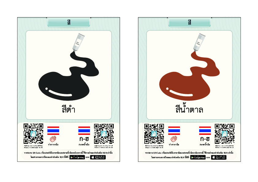 | คำอธิบาย : บัตรภาพคำศัพท์พหุภาษาสำหรับช่วยการอ่านและเขียนภาษาไทยให้แก่นักเรียนที่มีความบกพร่องทางการได้ยิน แต่ละบัตรภาพจะมีรูปภาพประกอบคำศัพท์และคิวอาร์โค้ดที่เชื่อมต่อไปยังวิดีโอการสะกดนิ้วมือและท่าภาษามือของคำศัพท์บนบัตรภาพนั้นๆ นักเรียนที่บกพร่องทางการได้ยินสามารถเรียนรู้การอ่านและเขียนคำศัพท์ผ่านการใช้แท็บเล็ตหรือสมาร์ทโฟนอ่านคิวอาร์โค้ดบนบัตรภาพคำศัพท์ เพื่อแสดงผลเป็นวิดีโอภาษามือให้เข้าใจได้ง่ายและเรียนด้วยตนเองได้บ่อยครั้งตามที่ต้องการ |