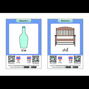 | คำอธิบาย : บัตรภาพคำศัพท์พหุภาษาสำหรับช่วยการอ่านและเขียนภาษาไทยให้แก่นักเรียนที่มีความบกพร่องทางการได้ยิน แต่ละบัตรภาพจะมีรูปภาพประกอบคำศัพท์และคิวอาร์โค้ดที่เชื่อมต่อไปยังวิดีโอการสะกดนิ้วมือและท่าภาษามือของคำศัพท์บนบัตรภาพนั้นๆ นักเรียนที่บกพร่องทางการได้ยินสามารถเรียนรู้การอ่านและเขียนคำศัพท์ผ่านการใช้แท็บเล็ตหรือสมาร์ทโฟนอ่านคิวอาร์โค้ดบนบัตรภาพคำศัพท์ เพื่อแสดงผลเป็นวิดีโอภาษามือให้เข้าใจได้ง่ายและเรียนด้วยตนเองได้บ่อยครั้งตามที่ต้องการ |