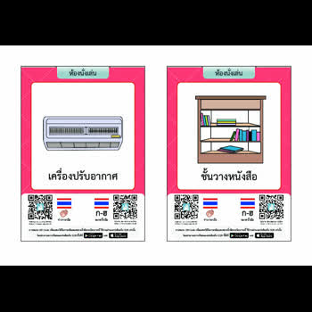 | คำอธิบาย : บัตรภาพคำศัพท์พหุภาษาสำหรับช่วยการอ่านและเขียนภาษาไทยให้แก่นักเรียนที่มีความบกพร่องทางการได้ยิน แต่ละบัตรภาพจะมีรูปภาพประกอบคำศัพท์และคิวอาร์โค้ดที่เชื่อมต่อไปยังวิดีโอการสะกดนิ้วมือและท่าภาษามือของคำศัพท์บนบัตรภาพนั้นๆ นักเรียนที่บกพร่องทางการได้ยินสามารถเรียนรู้การอ่านและเขียนคำศัพท์ผ่านการใช้แท็บเล็ตหรือสมาร์ทโฟนอ่านคิวอาร์โค้ดบนบัตรภาพคำศัพท์ เพื่อแสดงผลเป็นวิดีโอภาษามือให้เข้าใจได้ง่ายและเรียนด้วยตนเองได้บ่อยครั้งตามที่ต้องการ |