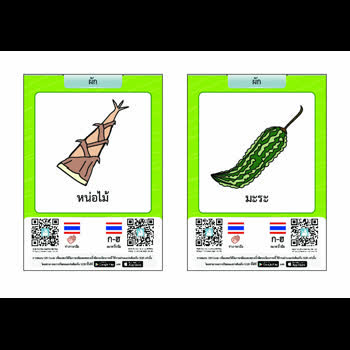 | คำอธิบาย : บัตรภาพคำศัพท์พหุภาษาสำหรับช่วยการอ่านและเขียนภาษาไทยให้แก่นักเรียนที่มีความบกพร่องทางการได้ยิน แต่ละบัตรภาพจะมีรูปภาพประกอบคำศัพท์และคิวอาร์โค้ดที่เชื่อมต่อไปยังวิดีโอการสะกดนิ้วมือและท่าภาษามือของคำศัพท์บนบัตรภาพนั้นๆ นักเรียนที่บกพร่องทางการได้ยินสามารถเรียนรู้การอ่านและเขียนคำศัพท์ผ่านการใช้แท็บเล็ตหรือสมาร์ทโฟนอ่านคิวอาร์โค้ดบนบัตรภาพคำศัพท์ เพื่อแสดงผลเป็นวิดีโอภาษามือให้เข้าใจได้ง่ายและเรียนด้วยตนเองได้บ่อยครั้งตามที่ต้องการ |