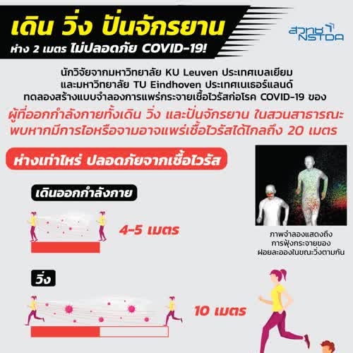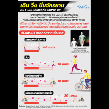 | คำอธิบาย : นักวิจัยจากมหาวิทยาลัย KU Leuven ประเทศเบลเยียม และมหาวิทยาลัย TU Eindhoven ประเทศเนเธอร์แลนด์ ทดลองสร้างแบบจำลองการแพร่กระจายเชื้อไวรัสก่อโรค COVID-19 ของ "ผู้ที่ออกกำลังกายทั้งเดิน วิ่ง และปั่นจักรยาน ในสวนสาธารณะพบหากมีการไอหรือจาม อาจแพร่เชื้อไวรัสได้ไกลถึง 20 เมตร"แล้วจะต้องออกกำลังกายด้วยการ เดิน วิ่ง ปั่นจักรยาน ในระยะห่างเท่าไหร่ จึงจะปลอดภัยจากเชื้อไวรัส .... - เดินออกกำลังกาย ให้มีระยะห่าง 4-5 เมตร- การวิ่ง ให้มีระยะห่าง 10 เมตร- ปั่นจักรยานช้าๆ ให้มีระยะห่าง 10 เมตร- ปั่นจักรยานด้วยความเร็ว ให้มีระยะห่าง 20 เมตรข้อมูลอ้างอิง : https://medium.com/@jurgenthoelen/belgian-dutch-study-why-in-times-of-covid-19-you-can-not-walk-run-bike-close-to-each-other-a5df19c77d08เรียบเรียงข้อมูลโดย : ฝ่ายสร้างสรรค์สื่อและผลิตภัณฑ์จัดทำสื่อโดย : ฝ่ายผลิตสื่อสมัยใหม่ |