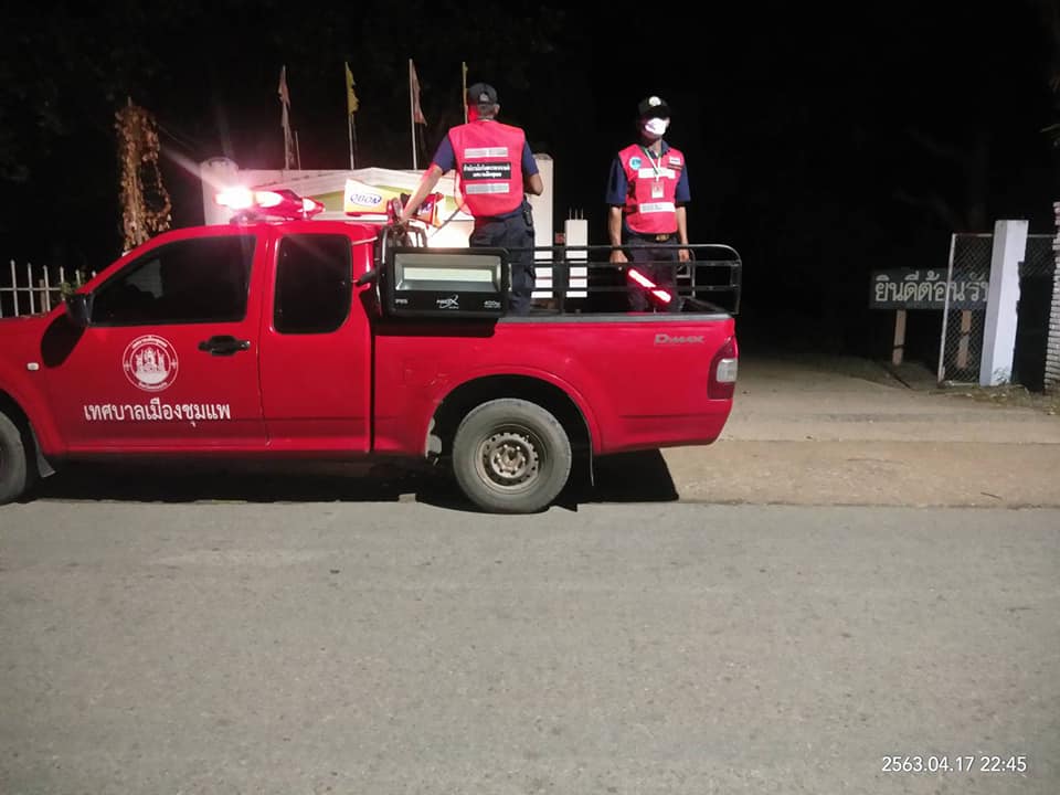 | คำอธิบาย : ค่ำวันศุกร์ที่ 17 เมษายน 2563 เจ้าหน้าที่เทศบาลเมืองชุมแพ ได้รับมอบหมายจากนายสมเกียรติ ดีบุญมี ณ ชุมแพ นายกเทศมนตรีเมืองชุมแพ ร่วมบูรณาการกำลังกับเจ้าหน้าที่ตำรวจ ฝ่ายปกครอง ออกตรวจพื้นที่ ตามพระราชกำหนดการบริหารราชการในสถานการณ์ฉุกเฉิน |