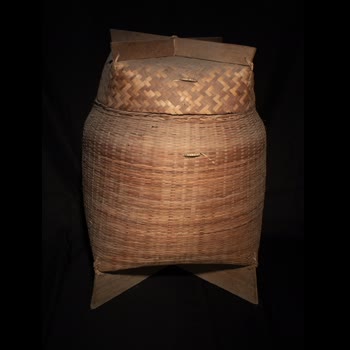 | คำอธิบาย : ก่องข้าวหลวง เครื่องจักสานขนาดใหญ่ ใช้ตอกไม้ไผ่สานละเอียดขึ้นรูปเป็นก่องข้าว มีฝาปิดสานใช้ไม้ตีขัดด้านบนฝา ก้นมีไม้ตีขัดเพื่อให้สามารถวางได้ ใช้ใส่ข้าวเหนียวหนึ้งหรือสิ่งของที่รับประทานในปริมาณมาก |