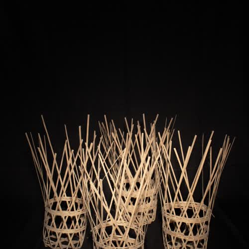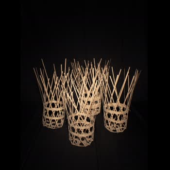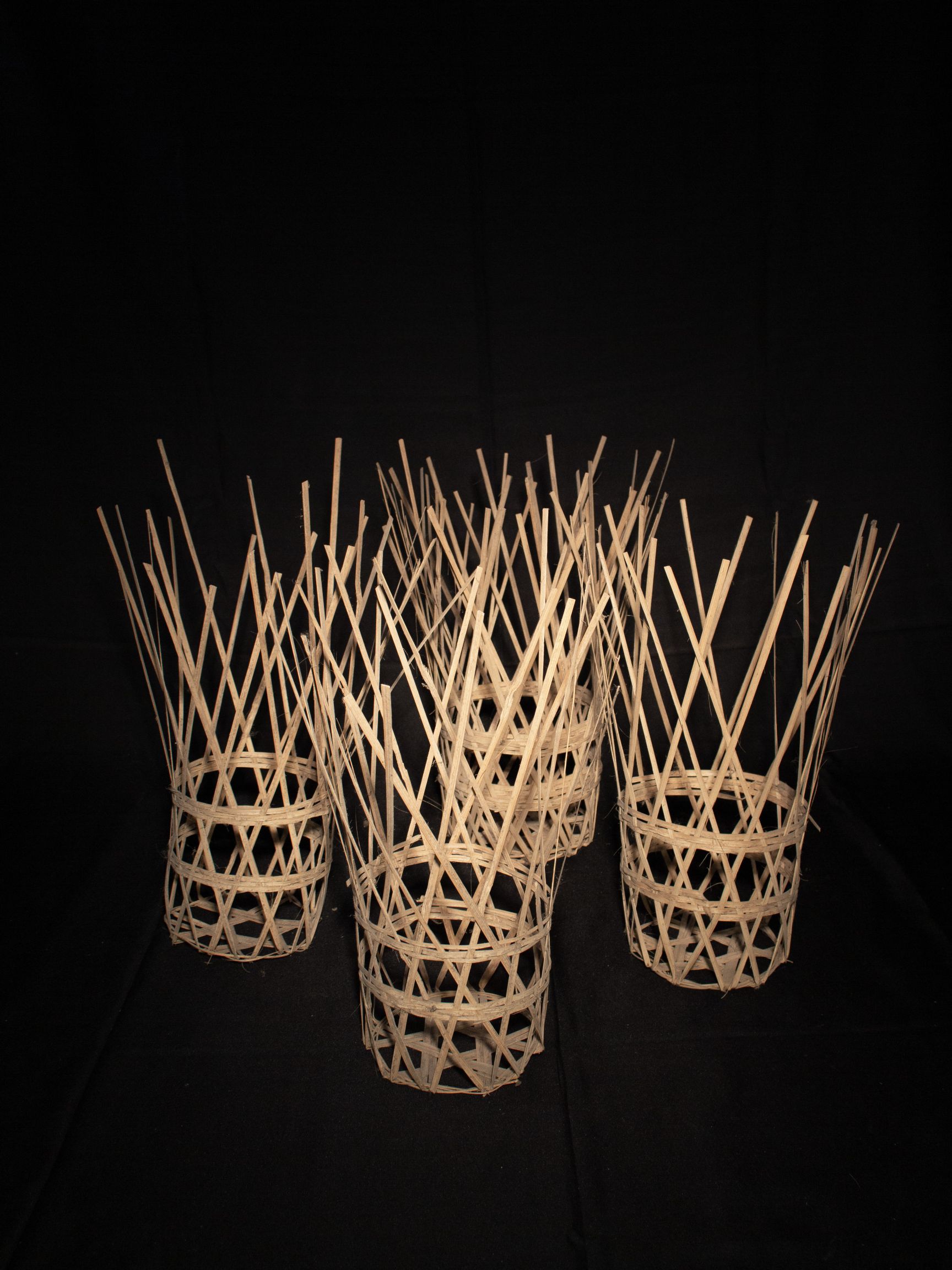 | คำอธิบาย : ก๋วยสลาก เครื่องจักสาน สานด้วยตอกไม้ไผ่ สานห่าง ๆ ให้เห็นเป็นช่องไฟเหมือนดาว 5 แฉก มี 5 ชิ้น ชิ้นเล็ก 3 ชิ้น ชิ้นใหญ่ 2 ชิ้น ด้านบนปล่อยตอกไว้ไม่มีการสาน ใช้ใส่เครื่องสัการะในงานสลาก |