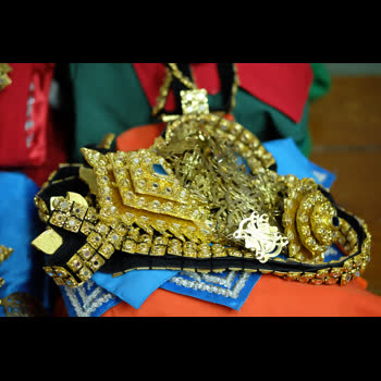 | คำอธิบาย : เครื่องประดับตัวละครพระ (นายโรง) ที่ห็นตามภาพมีทับทรวง สายสังวาลย์ เข็มขัดพร้อมหัว กรองคอตัวพระ |