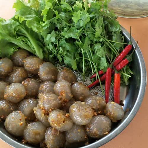 | คำสำคัญ : อาหารว่าง, ขนมหวาน, สาคูไส้หมู, แป้งมันสำปะหลัง |