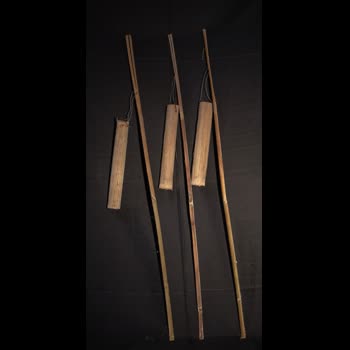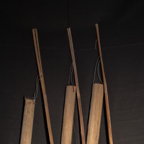 | คำอธิบาย : กระบอกน้ำหยาด มีจำนวน 12 ชิ้น มีขนาดเท่ากัน กระบอกทำจากไม้ไผ่ เกลาเอาผิวไม้ออก เจาะรูเพื่อร้อยเชือกหรือลวด ส่วนก้านที่ใช้ถือเป็นไม้ไผ่เหลาเป็นแท่งยาว ผ่าด้านบนเพื่อใช้คล้องลวดหรือเชือกที่มัดติดกับกระบอกไม้ไผ่แล้ว ใช้ในพิธีกรรมศพ สมัยก่อนเมื่อก่อนนำศพขึ้นเมรุ จะให้พระสวดและหยาดน้ำ จะนำกระบอกนี้ไปวางไว้ใกล้ ๆ โลงศพ เพื่อให้พระมาบังสกุล และหยาดน้ำ |