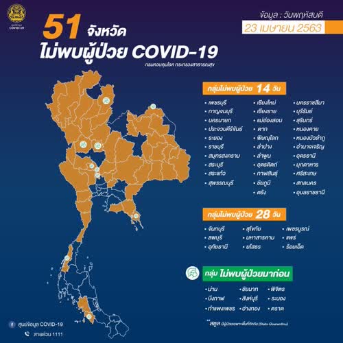 (2563). "51 จังหวัด ไม่พบผู้ป่วย COVID-19 ข้อมูล 23 เมษายน 2563".