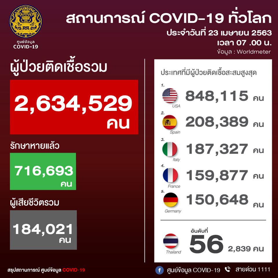สถานการณ์ COVID-19 ทั่วโลก ประจำวันที่ 23 เมษายน 2563 เวลา 07.00 น.