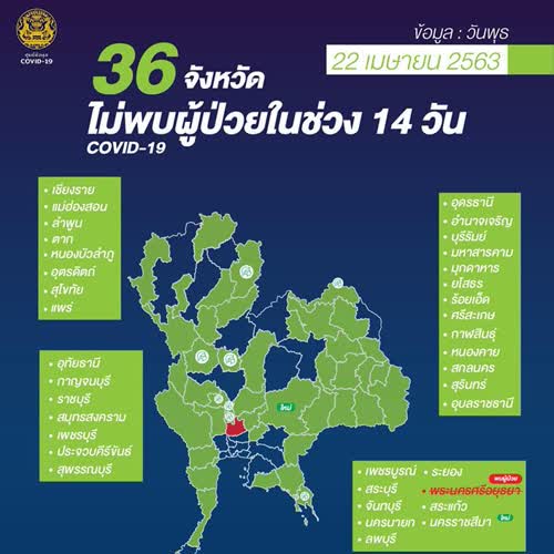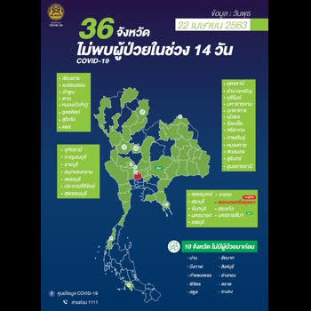 (2563). "36 จังหวัด ไม่พบผู้ป่วยในช่วง 14 วัน COVID-19 ข้อมูล 22 เมษายน 2563".
