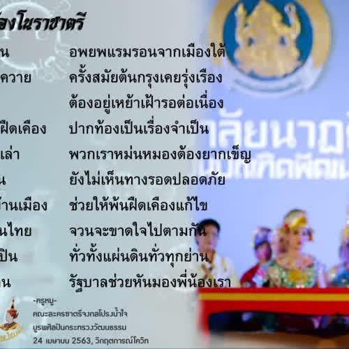 | คำสำคัญ : ศิลปะการแสดง, โควิด19, ร้องชาตรี, covid, ศิลปินพื้นบ้าน, โควิด, อยู่บ้าน หยุดเชื้อ เพื่อชาติ, ร่าย, นาฏศิลป์, บูรพศิลปินกระทรวงวัฒนธรรม, ร่ายชาตรี, covid-19, ละครชาตรี, ชาตรี |