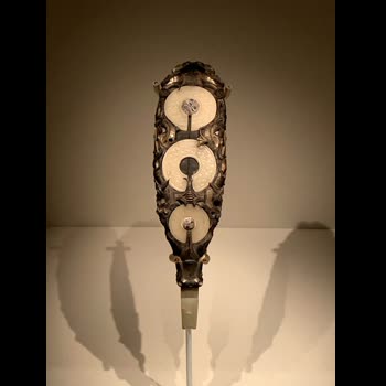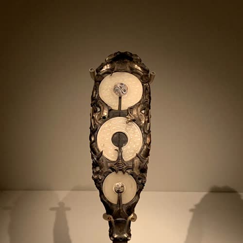 | คำอธิบาย : หัวเข็มขัดเงินชุบทอง ฝังด้วยหยกขาว 3 ชิ้น แกะสลักทรงกลมเจาะรูตรงกลาง (221-403 ปีก่อนคริสตกาล) ยุครณรัฐ (ยุคจั้นกั๋ว) ขุดพบที่มณฑลเหอหนานเมื่อปี ค.ศ. 1951 สมบัติของพิพิธภัณฑ์สถานแห่งชาติประเทศจีน 中国国家博物馆 |
