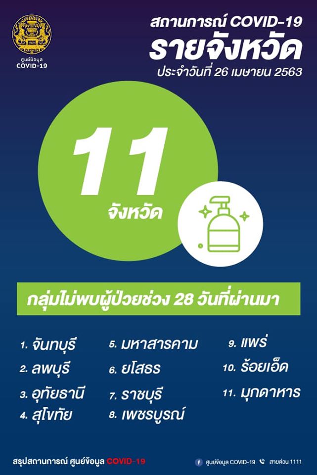(2563). "58 จังหวัด ไม่พบผู้ป่วย COVID-19 และสถานการณ์ COVID-19 รายจังหวัด ข้อมูล 26 เมษายน 2563".