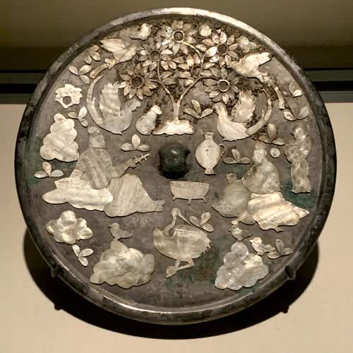 | คำอธิบาย : กระจกสัมฤทธิ์ลายฝังมุก (ด้านหลังขัดเงาเพื่อส่อง) ด้านหน้าประดับด้วยมุกเป็นภาพการสังสรรค์ในสวนมีคนเล่นดนตรี คนดื่ม มีเด็กรับใช้ ภาชนะ และนกต่างชนิด แสดงให้เห็นถึงความรุ่มรวยของชีวิตในยุคราชวงศ์ถัง\สมัยราชวงศ์ถัง ปี ค.ศ. 756 ขุดพบที่เมืองลั่วหยาง เมืองหลวงของราชวงศ์ถัง มณฑลเหอหนาน เมื่อปี ค.ศ. 1955สมบัติของพิพิธภัณฑ์สถานแห่งชาติประเทศจีน กรุงปักกิ่ง 中国国家博物馆 |