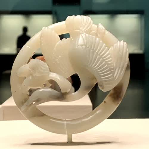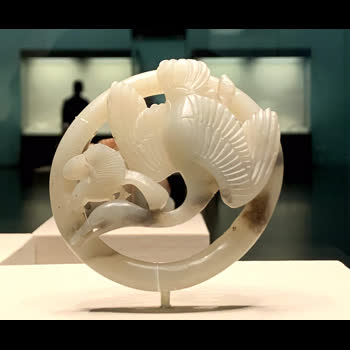 | คำอธิบาย : หยกขาวชิ้นเล็กชิ้นนี้ ถือเป็นหนึ่งงานแกะสลักที่ทรงคุณค่างานหนึ่งในประวัติศาสตร์จีน เป็นงานแกะสลักประเภทฉลุ (openwork) ซึ่งเป็นงานที่ทำได้ยากมากบนหินหยก ซึ่งมีความแข็งสูง ศิลปินสามารถฉลุหินออกมาเป็นทรงกลมรูปนกกระเรียนได้อย่างแทบสมบูรณ์ในองค์ประกอบ และชิ้นนี้เป็นรุ่นแรกๆ ที่สุดที่มีงานออกแบบแกะสลักหยกประเภทฉลุสมัยราชวงศ์เหลียว หรือ จิน 辽/金 (ค.ศ. 916-1125) |