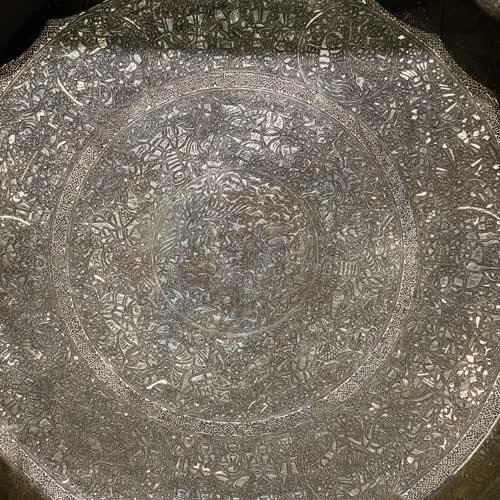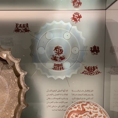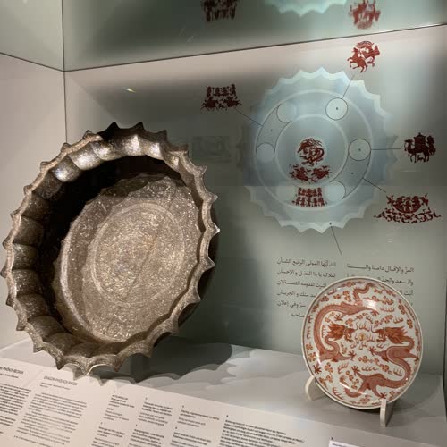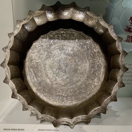 | คำอธิบาย : อ่างทองเหลืองมังกร-หงส์ใบใหญ่ชิ้นนี้ พบที่เมืองโมซูล ประเทศอิรัก เป็นหลักฐานการผสมผสานทางวัฒนธรรมงานศิลปะระหว่างจีนกับศิลปะอิสลาม จะเห็นได้ว่ามีการลงลายมังกรและหงส์ สัญญลักษณ์จักรพรรติและพระราชินีแห่งราชสำนัก มีฉากล่าสัตว์ เดินทางด้วยอูฐ มีฉากผู้ครองราชพร้อมมโหรสพ รูปแบบของอ่างเป็นแบบอิสลาม ลายแฉก แต่ลวดลายที่แทรกมาเป็นของจีน การผสมผสานงานออกแบบนี้ แสดงให้เห็นถึงความรุ่งเรืองของอาณาจักรมองโกล (ราชวงศ์หยวนของจีน ในคริสตศักราชที่ 13) ที่ได้แผ่ขยายอาณาจักรมาถึงตะวันออกกลาง มาถึงเมืองโมซูล ซึ่งงานฝีมือของอ่างใบนี้มีบันทึกว่าเป็นช่างฝีมือของเมืองนี้ นอกจากการทำลวดลายต้วยการเคาะแล้ว ยังมีร่องรอยการฝังลายเส้นด้วยลวดเงินและทองอีกด้วย |