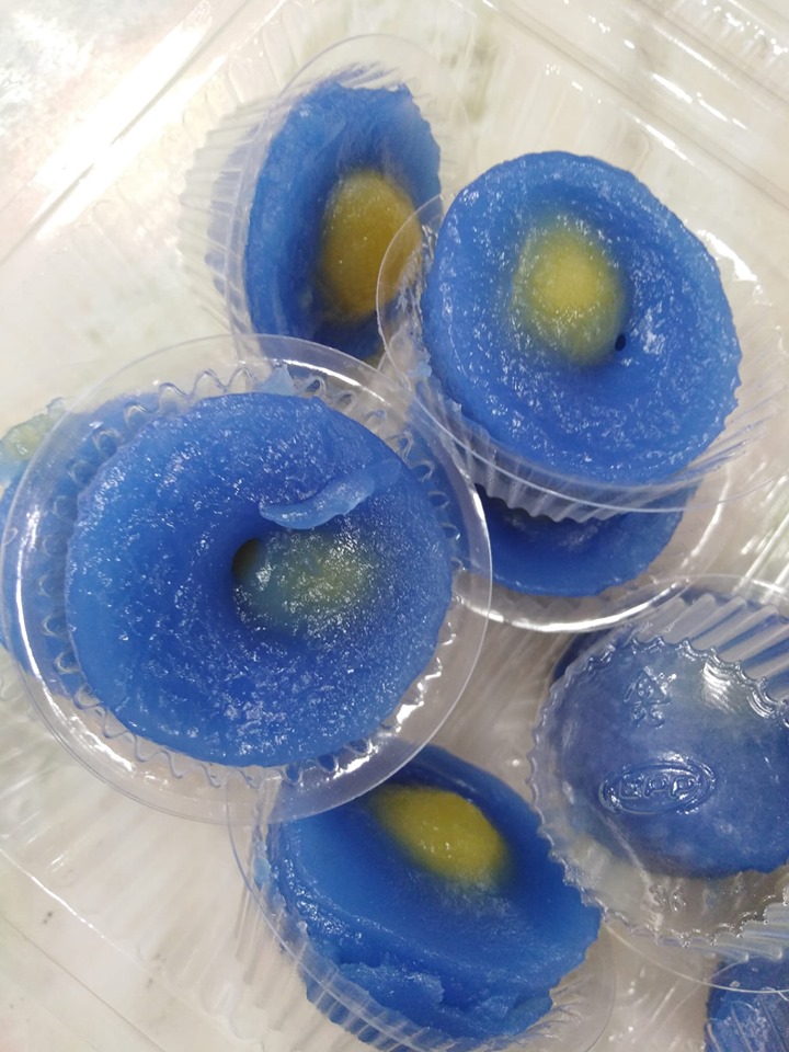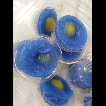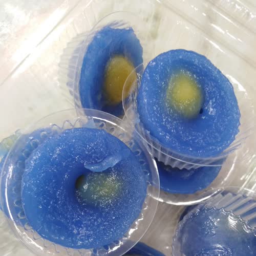 | คำอธิบาย : ขนมบุหลันดั้นเมฆ ขนมสีฟ้าส่วนตรงกลางเป็นสีเหลือง คล้ายๆ พระจันทร์ลอยอยู่กลางท้องฟ้า ด้วยรูปลักษณะที่เสมือนดวงจันทร์ลอยอยู่กลางท้องฟ้าจึงมีชื่อเก๋แบบนี้ |
