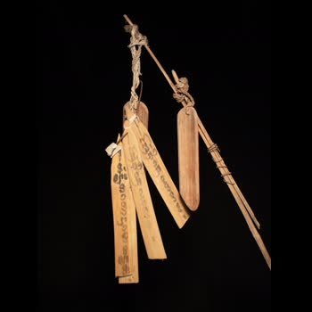 | คำอธิบาย : นโมต๋าบอด ทำจากไม้ไผ่ เหลาเป็นแผ่น ชิ้นไม่ใหญ่ จำนวน 6 ชิ้น มีขนาดไม่เท่ากัน เขียนยันต์ติดไว้แต่ละแผ่น ทุกแผ่นจะมีรูไว้สำหรับร้อยเชือก เพื่อร้อยติดกับก้านไม้ไผ่ยาวอีกที เป็นเครื่องลางที่เชื่อว่าจะป้องกันผี หรือศัตรูข้าวที่จะมาทำลายข้าว หากผีเข้ามาจะทำให้ผีตาบอด |