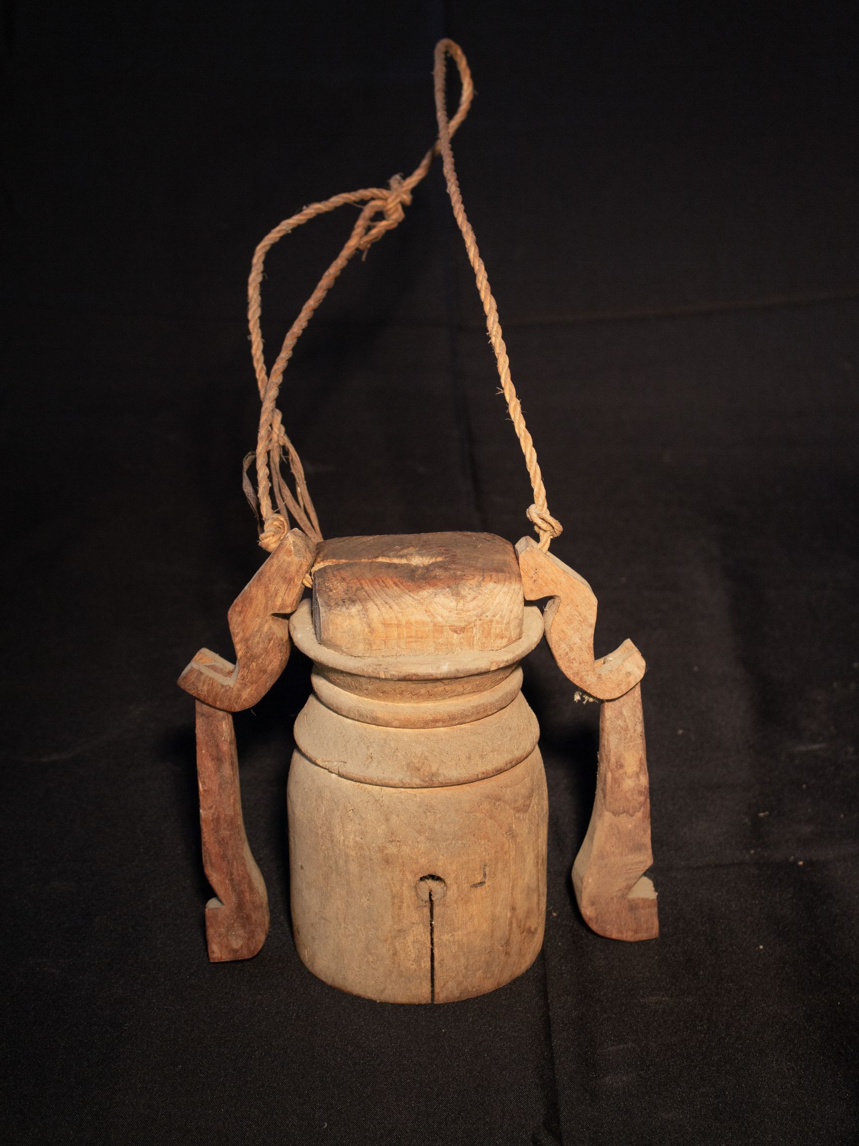 | คำอธิบาย : ฮอกขวัก ทำจากไม้ชิ้นเดียว ควักเนื้อไม้ตรงกลางให้กลวง และทำไม้ที่ทำให้เกิดเสียงห้อยไว้ด้านข้างสองข้าง ใช้สำหรับคล้องคอวัว คอควาย |