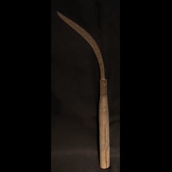 | คำอธิบาย : เคียว ใบเคียวทำจากโลหะ ด้านหนึ่งทำเป็นซี่เล็ก ๆ เหมือนฟันปลาอีกด้านเรียบ รูปโค้งงอ ประกอบเข้ากับไม้เนื้ออ่อนเหลาเป็นด้ามรัดช่วงรอยต่อด้วยโลหะ เพื่อให้ใบเคียวและด้ามสามารถยึดติดกันได้แน่น ใช้ในการเกี่ยวข้าว |