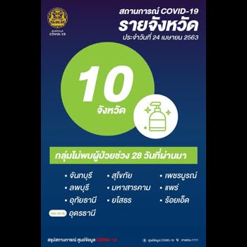 ชื่อเรื่อง : 55 จังหวัด ไม่พบผู้ป่วย COVID-19 และสถานการณ์ COVID-19 รายจังหวัด ประจำวันที่ 24 เมษายน 2563 |