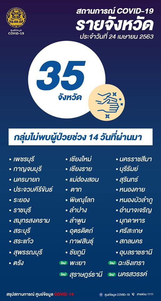 55 จังหวัด ไม่พบผู้ป่วย COVID-19 และสถานการณ์ COVID-19 รายจังหวัด ประจำวันที่ 24 เมษายน 2563
