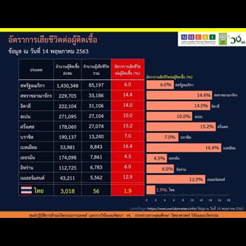 สถิติสำคัญเกี่ยวกับโรคโควิด-19 ในแต่ละประเทศทั่วโลก ข้อมูล ณ วันที่ 14 พฤษภาคม 2563 ได้รับใบอนุญาตภายใต้ ให้เผยแพร่-โดยต้องระบุที่มาแต่ห้ามดัดแปลงและห้ามใช้เพื่อการค้า 3.0 Thailand.