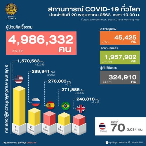สถานการณ์ COVID-19 ทั่วโลก ประจำวันที่ 20 พฤษภาคม 2563 เวลา 10.00 น.