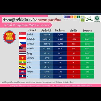 สถานการณ์การติดเชื้อโควิด-19 ในอาเซียน ณ วันที่ 19 พฤษภาคม 2563 เวลา 19.30 น.
