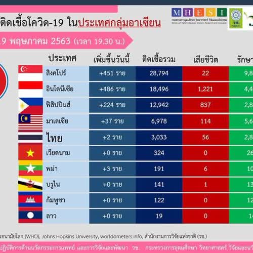 "สถานการณ์การติดเชื้อโควิด-19 ในอาเซียน ณ วันที่ 19 พฤษภาคม 2563 เวลา 19.30 น.".