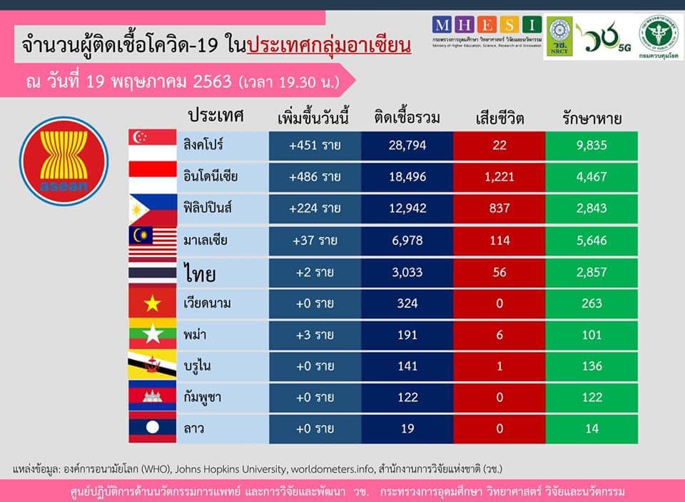 (2563). สถานการณ์การติดเชื้อโควิด-19 ในอาเซียน ณ วันที่ 19 พฤษภาคม 2563 เวลา 19.30 น.,