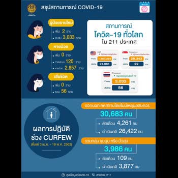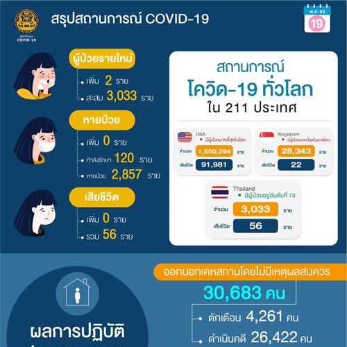 (2563). "สรุปสถานการณ์ COVID-19 วันที่ 19 พ.ค. 2563".