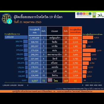 สถิติสำคัญเกี่ยวกับโรคโควิด-19 ในแต่ละประเทศทั่วโลก ข้อมูล ณ วันที่ 21 พฤษภาคม 2563 ได้รับใบอนุญาตภายใต้ ให้เผยแพร่-โดยต้องระบุที่มาแต่ห้ามดัดแปลงและห้ามใช้เพื่อการค้า 3.0 Thailand.