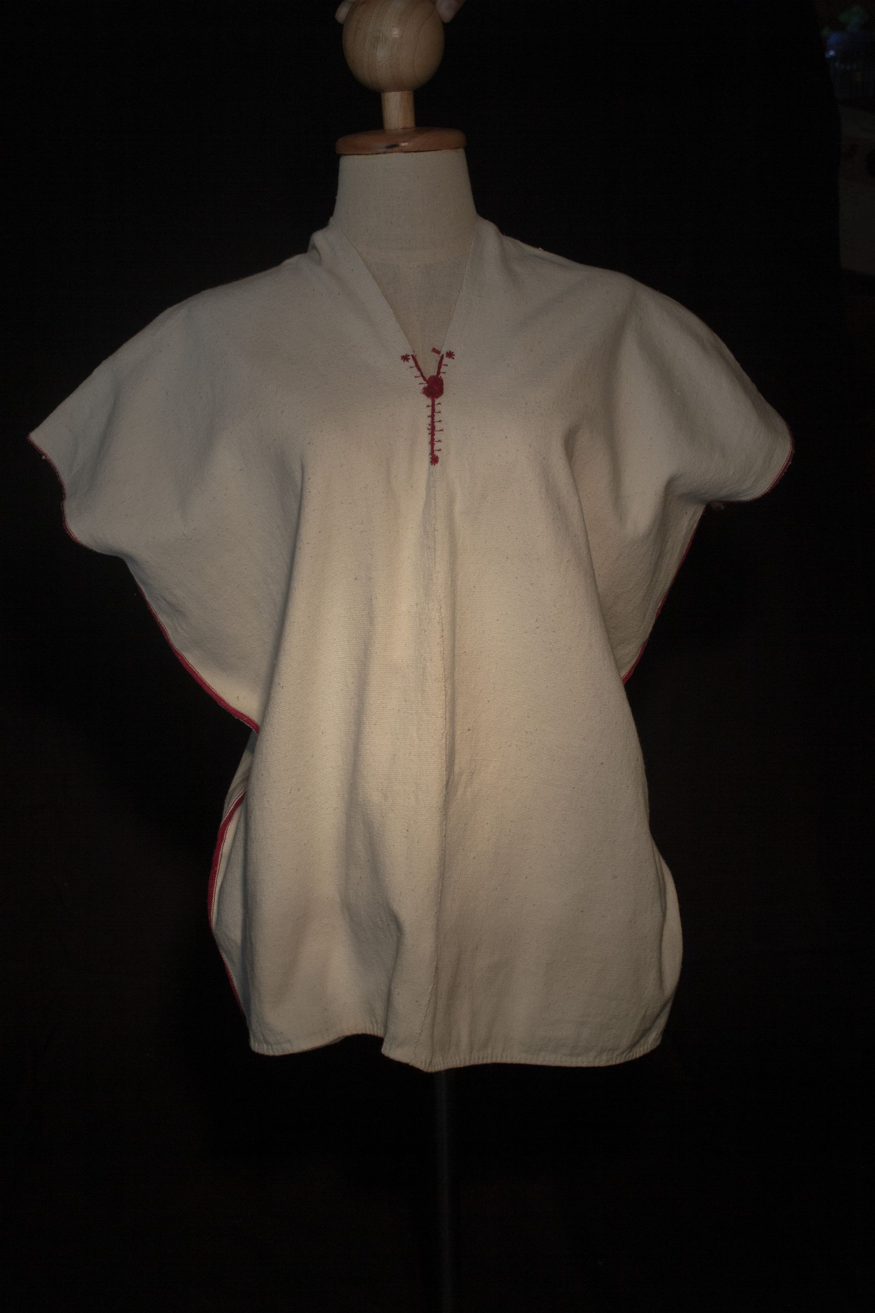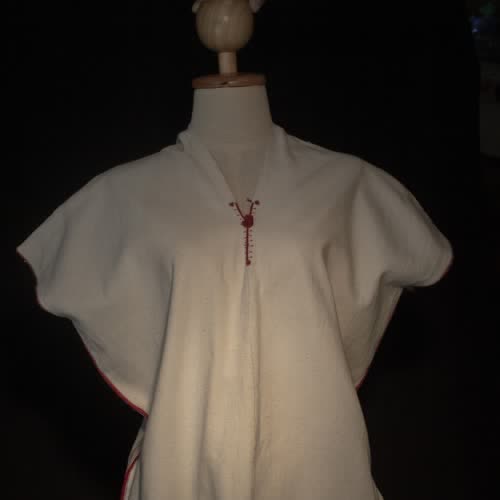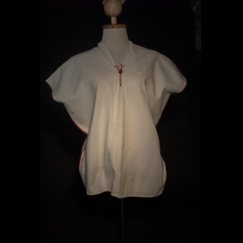 | คำอธิบาย : เสื้อกะเหรี่ยง ทอจากฝ้ายสีขาว ตัดเย็บเป็นเสื้อคอวี ไม่มีแขน เป็นแขนที่ติดกับตัวเลย ด้านข้างและคอ เดินเส้นด้ายสีแดง คอด้านหน้ามีพู่สีแดง ด้านข้างแหวกเพื่อให้สวมใส่ง่าย ใช้สวมใส่ |