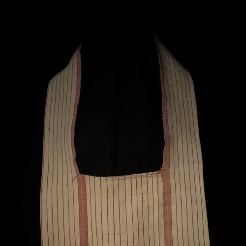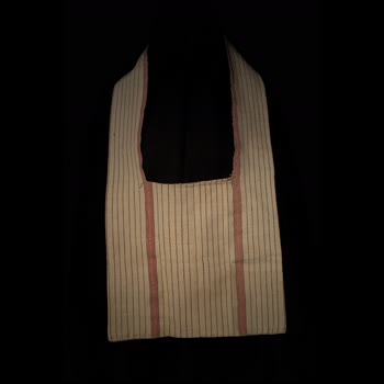 | คำอธิบาย : ย่าม ทอจากฝ้ายสีขาว ลายเส้นสีแดง ตัดเย็บเป็นย่าม โดยก้นย่ามเย็บติดกับสายเล่นลวดลายสีแดง ไว้ตรงขอบสายด้านใน ใช้ใส่ของ |
