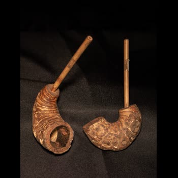 | คำอธิบาย : บ้องยาสูบ บ้องยาสูบทำมาจากรากไม้ไผ่ มาควักเอาเนื้อไม้ข้างในออกทำให้ข้างในกลวง มีรูปลักษณะ งอ ด้านบนเอากระบอกไม้ไผ่ขนาดเล็ก มาเสียบเข้ากับรูที่ทำไว้ 2 ชิ้น ขนาดไม่เท่ากัน ได้มาจากลัวะ ใช้สูบใบยาสูบ |