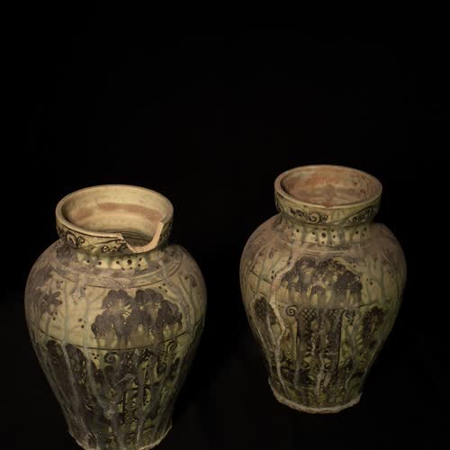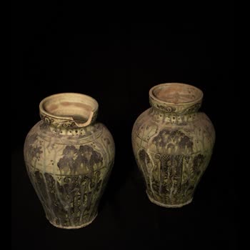 | คำอธิบาย : แจกัน เครื่องสังคโลกล้านนา เป็นเครื่องปั้นดินเผาที่เคลือบหรือเผาแบบศิลาดล มีทั้งหมด 2 ชิ้น ปากและก้นมีขนาดเท่ากัน และทำโค้งออกตั้งแต่ก้นจนถึงคอแจกัน ทำคอแล้วปากที่บานออกเล็กน้อย มีเคลือบด้วยน้ำยาธรรมชาติการวาดลวดลายคล้ายต้นไม้ด้วยสีดำ |