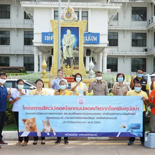 | คำอธิบาย : นายณัฐภูมิ นนทสิริกุล ปลัดเทศบาลเมืองชุมแพ พร้อมด้วยเจ้าหน้าที่กองสาธารณสุขและสิ่งแวดล้อม ถ่ายรูปเป็นที่ระลึกก่อนออกฉีดวัคซีนป้องกันโรคพิษสุนัขบ้าชุมชนในเขตเทศบาลเมืองชุมแพตามโครงการสัตว์ปลอดโรคคนปลอดภัยจากโรคพิษสุนัขบ้า ตามพระปณิธานศาสตราจารย์ ดร.สมเด็จพระเจ้าน้องนางเธอ เจ้าฟ้าจุฬาภรณวลัยลักษณ์ อัครราชกุมารี กรมพระศรีสวางควัฒน วรขัตติยราชนารี |