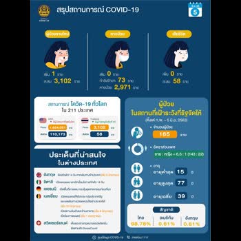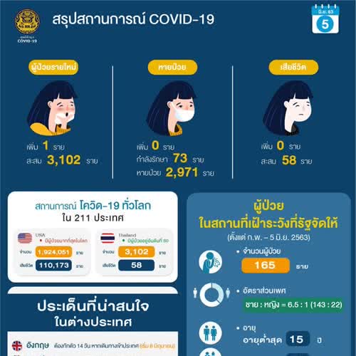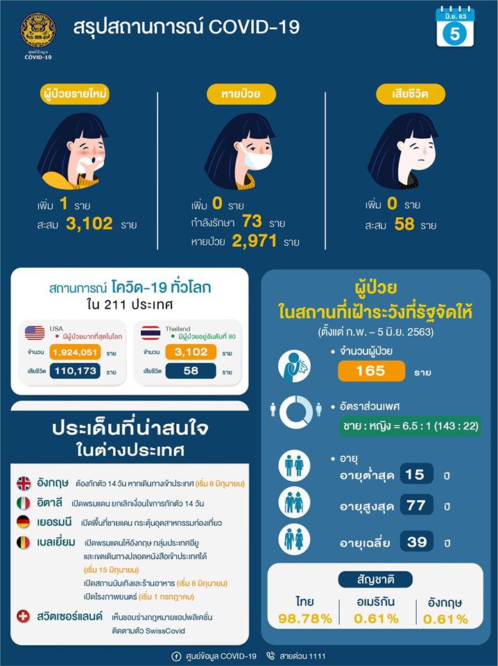 (2563). "สรุปสถานการณ์ COVID-19 วันที่ 5 มิ.ย. 2563".