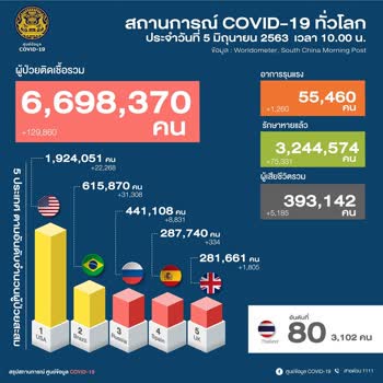 สถานการณ์ COVID-19 ทั่วโลก ประจำวันที่ 5 มิถุนายน 2563 เวลา 10.00 น.