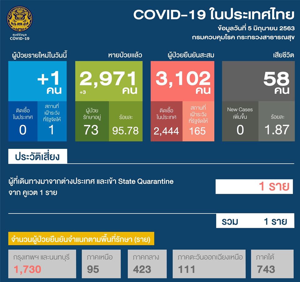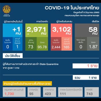 (2563). "COVID-19 ในประเทศไทย ข้อมูลวันที่ 5 มิถุนายน 2563".
