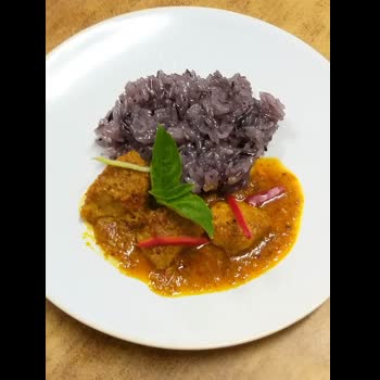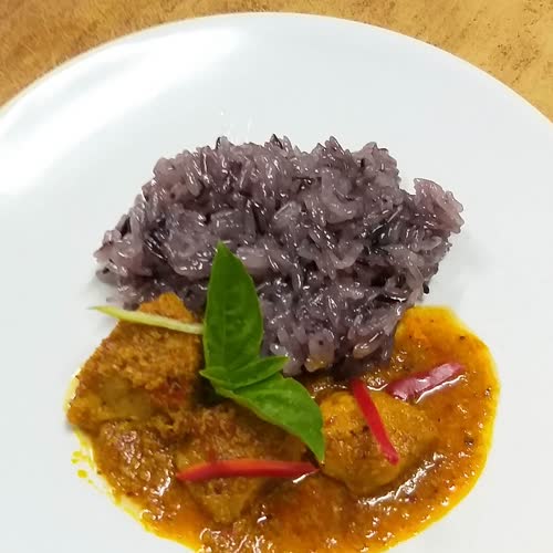 | คำอธิบาย : คนใต้ฝั่งอันดามัน กินข้าวเหนียวกับแกงไก่ในงานแต่งงาน บ่งบอกถึงความสมัครสมานเหนียวแน่นของคนต่างครอบครัวที่จะอย่ร่วมกัน ปกติจะเป็นใช้ข้าวเหนียวมูนสีขาวกับแกงไก่ แต่วันนี้ใช้ข้าวเหนียวดำกับแกงหมูน้ำแกงข้นๆ |