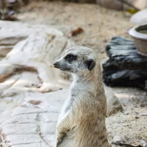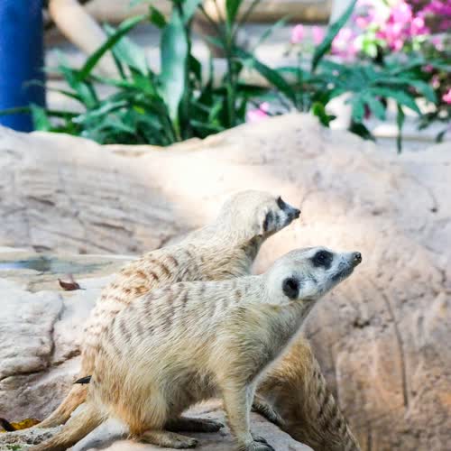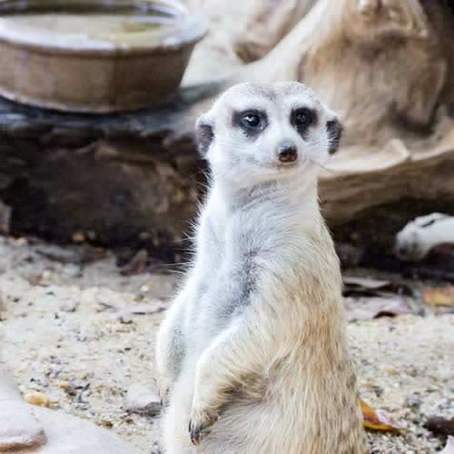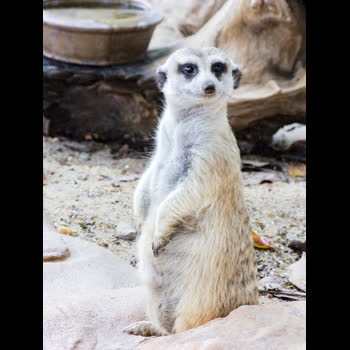 | คำอธิบาย : เมียร์แคต (อังกฤษ: meerkat, suricate; ชื่อวิทยาศาสตร์: Suricata suricatta) จัดอยู่ในไฟลัมสัตว์มีแกนสันหลัง ชั้นสัตว์เลี้ยงลูกด้วยนม มีขนาดลำตัวเล็ก น้ำหนักประมาณ 1 กิโลกรัม (2 ปอนด์) และสูงประมาณ 50 เซนติเมตร (20 นิ้ว) จัดอยู่ในวงศ์พังพอน (Herpestidae) มีถิ่นอาศัยอยู่ในทะเลทรายคาลาฮารีทางตอนใต้ของทวีปแอฟริกา |