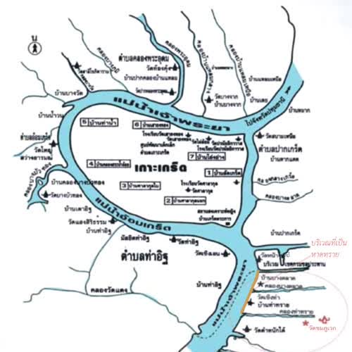 | คำอธิบาย : แผนที่บ้านปากเกร็ด บ้านบางตลาด บ้านท่าทราย และพื้นที่ใกล้เคียง |