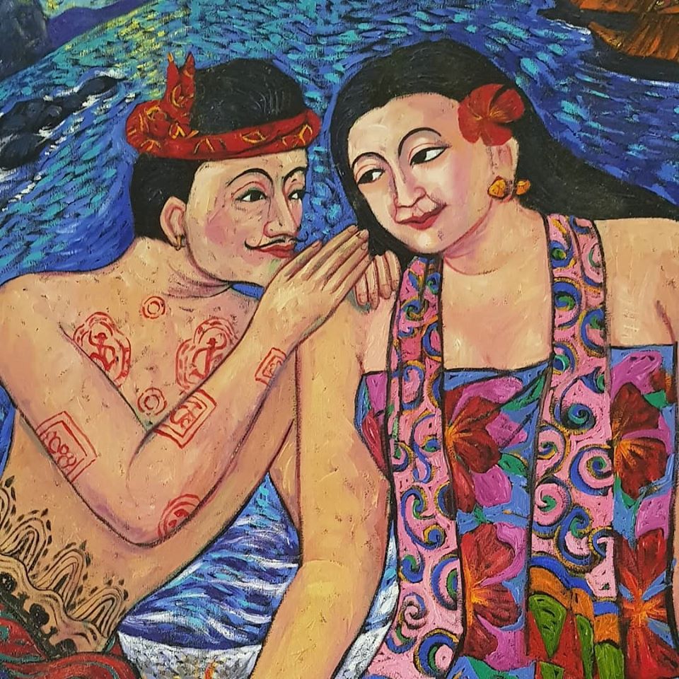 | คำอธิบาย : ปูม่านย่าม่าน หรือภาพ "กระซิบรักบันลือโลก" ภาพต้นฉบับเป็นภาพจิตกรรมฝาผนังภายในวัดภูมินทร์ จังหวัดน่าน เป็นผลงานการสร้างสรรค์จาก "หนานบัวผัน" จิตกรเชื้อสายไทยลื้อ ผลงานภาพวาดปูม่านย่าม่านนี้ได้รับการยอมรับว่าเป็นผลงานที่ปราณีตและเป็นภาพจิตกรรมฝาผนังที่โดดเด่นประจำวัดภูมินทร์ ภาพของปู่ม่านย่าม่านที่เห็นนี้เป็นภาพของผู้หญิงและผู้ชายคู่หนึ่งที่กำลังกระซิบเพื่อสนทนากัน ปู่ม่าน ย่าม่าน เป็นภาพของหญิงชายพม่าที่เป็นสามีภรรยากัน โดยคำว่า "ม่าน" คือ "พม่า" คำว่า ปู่ เป็นคำเรียกของผู้ชายที่พ้นวัยเด็กมาแล้ว ย่า (คำเดิมคือคำว่า "ง่า") เป็นคำเรียกของผู้หญิงที่พ้นวัยเด็กมาแล้ว ภาพ "ปู่ม่านย่าม่าน" เป็นหนึ่งในภาพจิตกรรมฝาผนังที่วาดขึ้นเมื่อครั้งมีการบูรณะซ่อมแซมวัดภูมินทร์เมื่อปี พ.ศ.2410 - 2417 ปัจจุบันภาพปู่ม่านย่าม่านกลายเป็นสัญลักษณ์ของเมืองน่านที่ปรากฏอยู่บนผลิตภัณฑ์ต่างๆ เช่น ภาพวาดที่เป็นของแต่งบ้าน ไปรษณียบัตร เป็นต้น |